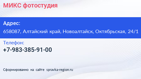 МИКС, фотостудия по адресу 658087, Алтайский край, Новоалтайск, Октябрьская, 24/1 в дальнейшем Организация, размещена в следующих категориях:
