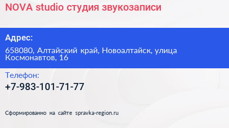 NOVA studio, студия звукозаписи по адресу 658080, Алтайский край, Новоалтайск, улица Космонавтов, 16 в дальнейшем Организация, размещена в следующих категориях: