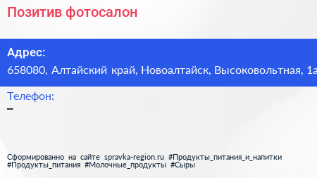 Позитив, фотосалон по адресу 658080, Алтайский край, Новоалтайск, Высоковольтная, 1а в дальнейшем Организация, размещена в следующих категориях: