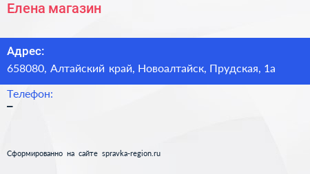 Елена, магазин по адресу 658080, Алтайский край, Новоалтайск, Прудская, 1а в дальнейшем Организация, размещена в следующих категориях: