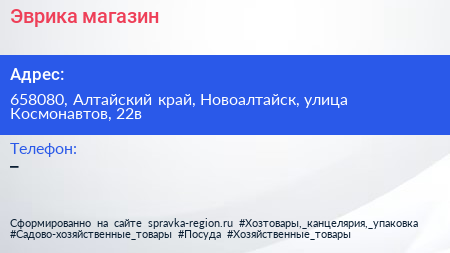 Эврика, магазин по адресу 658080, Алтайский край, Новоалтайск, улица Космонавтов, 22в в дальнейшем Организация, размещена в следующих категориях: