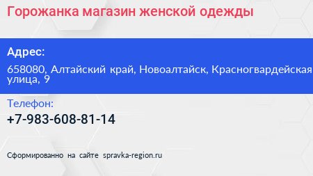 Горожанка, магазин женской одежды по адресу 658080, Алтайский край, Новоалтайск, Красногвардейская улица, 9 в дальнейшем Организация, размещена в следующих категориях: