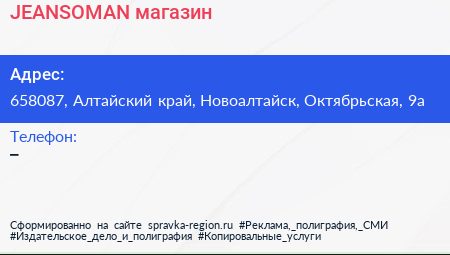 JEANSOMAN, магазин по адресу 658087, Алтайский край, Новоалтайск, Октябрьская, 9а в дальнейшем Организация, размещена в следующих категориях: