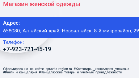 Магазин женской одежды по адресу 658080, Алтайский край, Новоалтайск, 8-й микрорайон, 29 в дальнейшем Организация, размещена в следующих категориях: