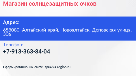 Магазин солнцезащитных очков по адресу 658080, Алтайский край, Новоалтайск, Деповская улица, 30а в дальнейшем Организация, размещена в следующих категориях: