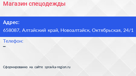 Магазин спецодежды по адресу 658087, Алтайский край, Новоалтайск, Октябрьская, 24/1 в дальнейшем Организация, размещена в следующих категориях: