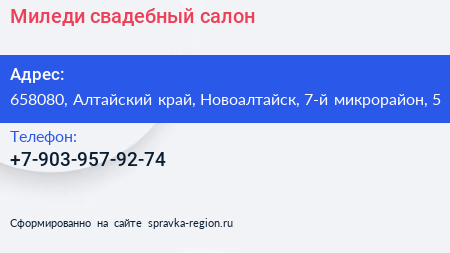 Миледи, свадебный салон по адресу 658080, Алтайский край, Новоалтайск, 7-й микрорайон, 5 в дальнейшем Организация, размещена в следующих категориях: