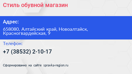 Стиль, обувной магазин по адресу 658080, Алтайский край, Новоалтайск, Красногвардейская, 9 в дальнейшем Организация, размещена в следующих категориях: