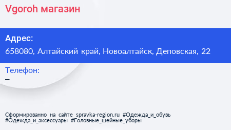 Vgoroh, магазин по адресу 658080, Алтайский край, Новоалтайск, Деповская, 22 в дальнейшем Организация, размещена в следующих категориях: