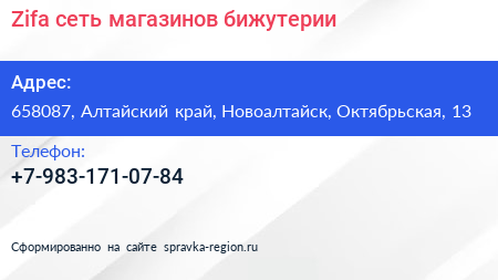 Zifa, сеть магазинов бижутерии по адресу 658087, Алтайский край, Новоалтайск, Октябрьская, 13 в дальнейшем Организация, размещена в следующих категориях: