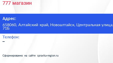 777, магазин по адресу 658060, Алтайский край, Новоалтайск, Центральная улица, 71Б в дальнейшем Организация, размещена в следующих категориях:
