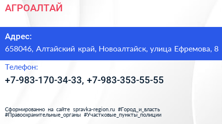 АГРОАЛТАЙ по адресу 658046, Алтайский край, Новоалтайск, улица Ефремова, 8 в дальнейшем Организация, размещена в следующих категориях: