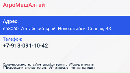 АгроМашАлтай по адресу 658060, Алтайский край, Новоалтайск, Сенная, 43 в дальнейшем Организация, размещена в следующих категориях:
