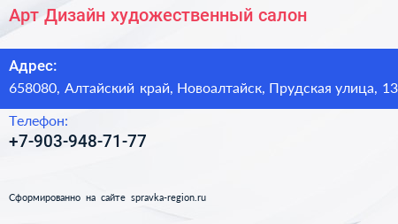 Арт-Дизайн, художественный салон по адресу 658080, Алтайский край, Новоалтайск, Прудская улица, 13 в дальнейшем Организация, размещена в следующих категориях: