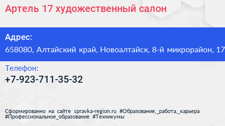 Артель 17, художественный салон по адресу 658080, Алтайский край, Новоалтайск, 8-й микрорайон, 17 в дальнейшем Организация, размещена в следующих категориях: