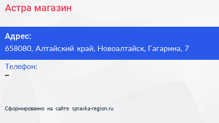 Астра, магазин по адресу 658080, Алтайский край, Новоалтайск, Гагарина, 7 в дальнейшем Организация, размещена в следующих категориях: