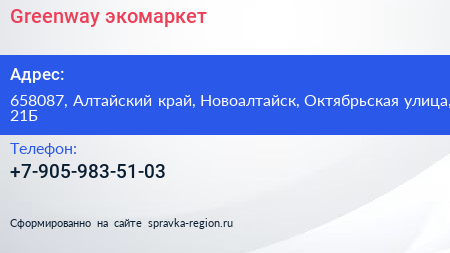 Greenway, экомаркет по адресу 658087, Алтайский край, Новоалтайск, Октябрьская улица, 21Б в дальнейшем Организация, размещена в следующих категориях: