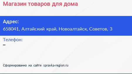 Магазин товаров для дома по адресу 658041, Алтайский край, Новоалтайск, Советов, 3 в дальнейшем Организация, размещена в следующих категориях: