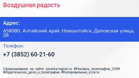 Воздушная радость по адресу 658080, Алтайский край, Новоалтайск, Деповская улица, 28 в дальнейшем Организация, размещена в следующих категориях: