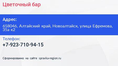 Цветочный бар по адресу 658046, Алтайский край, Новоалтайск, улица Ефремова, 35а к2 в дальнейшем Организация, размещена в следующих категориях: