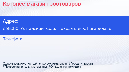 Котопес, магазин зоотоваров по адресу 658080, Алтайский край, Новоалтайск, Гагарина, 6 в дальнейшем Организация, размещена в следующих категориях: