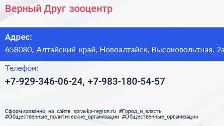 Верный Друг, зооцентр по адресу 658080, Алтайский край, Новоалтайск, Высоковольтная, 2а в дальнейшем Организация, размещена в следующих категориях: