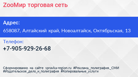 ZooМир, торговая сеть по адресу 658087, Алтайский край, Новоалтайск, Октябрьская, 13 в дальнейшем Организация, размещена в следующих категориях: