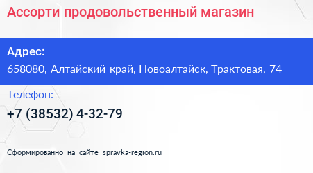 Ассорти, продовольственный магазин по адресу 658080, Алтайский край, Новоалтайск, Трактовая, 74 в дальнейшем Организация, размещена в следующих категориях: