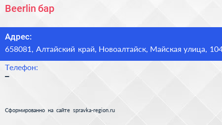 Beerlin, бар по адресу 658081, Алтайский край, Новоалтайск, Майская улица, 104 в дальнейшем Организация, размещена в следующих категориях: