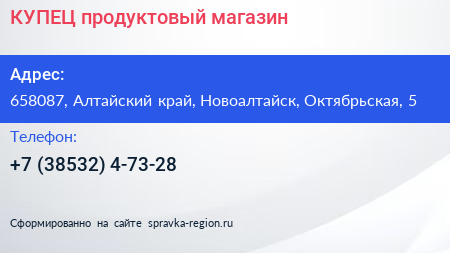 КУПЕЦ, продуктовый магазин по адресу 658087, Алтайский край, Новоалтайск, Октябрьская, 5 в дальнейшем Организация, размещена в следующих категориях: