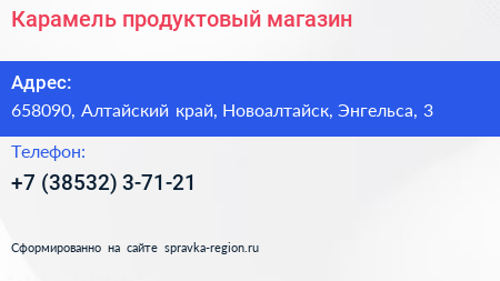 Карамель, продуктовый магазин по адресу 658090, Алтайский край, Новоалтайск, Энгельса, 3 в дальнейшем Организация, размещена в следующих категориях: