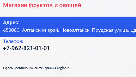 Магазин фруктов и овощей по адресу 658080, Алтайский край, Новоалтайск, Прудская улица, 1д в дальнейшем Организация, размещена в следующих категориях: