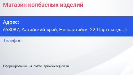 Магазин колбасных изделий по адресу 658087, Алтайский край, Новоалтайск, 22 Партсъезда, 5 в дальнейшем Организация, размещена в следующих категориях: