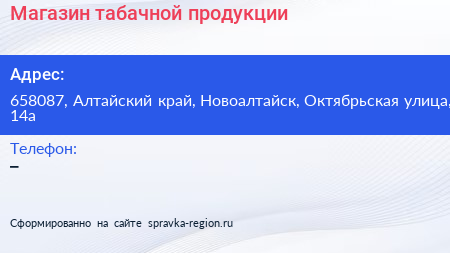 Магазин табачной продукции по адресу 658087, Алтайский край, Новоалтайск, Октябрьская улица, 14а в дальнейшем Организация, размещена в следующих категориях: