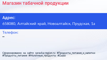 Магазин табачной продукции по адресу 658080, Алтайский край, Новоалтайск, Прудская, 1а в дальнейшем Организация, размещена в следующих категориях: