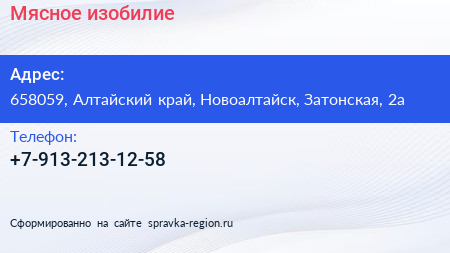 Мясное изобилие по адресу 658059, Алтайский край, Новоалтайск, Затонская, 2а в дальнейшем Организация, размещена в следующих категориях: