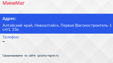 МиниМаг по адресу Алтайский край, Новоалтайск, Первая (Вагоностроитель-1 снт), 33а в дальнейшем Организация, размещена в следующих категориях: