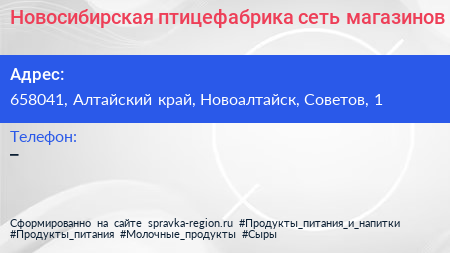 Новосибирская птицефабрика, сеть магазинов по адресу 658041, Алтайский край, Новоалтайск, Советов, 1 в дальнейшем Организация, размещена в следующих категориях: