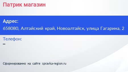 Патрик, магазин по адресу 658080, Алтайский край, Новоалтайск, улица Гагарина, 2 в дальнейшем Организация, размещена в следующих категориях: