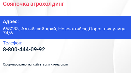 Сояночка, агрохолдинг по адресу 658083, Алтайский край, Новоалтайск, Дорожная улица, 74/6 в дальнейшем Организация, размещена в следующих категориях: