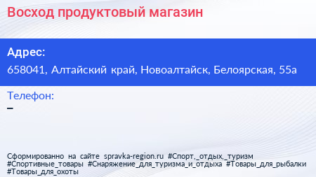 Восход, продуктовый магазин по адресу 658041, Алтайский край, Новоалтайск, Белоярская, 55а в дальнейшем Организация, размещена в следующих категориях: