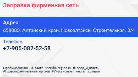 Заправка, фирменная сеть по адресу 658080, Алтайский край, Новоалтайск, Строительная, 3/4 в дальнейшем Организация, размещена в следующих категориях: