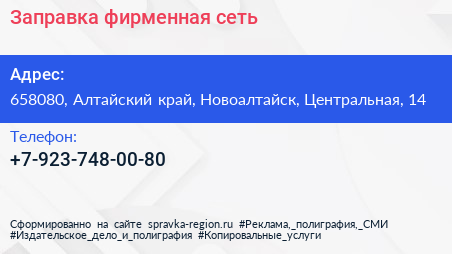 Заправка, фирменная сеть по адресу 658080, Алтайский край, Новоалтайск, Центральная, 14 в дальнейшем Организация, размещена в следующих категориях: