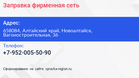 Заправка, фирменная сеть по адресу 658084, Алтайский край, Новоалтайск, Вагоностроительная, 36 в дальнейшем Организация, размещена в следующих категориях: