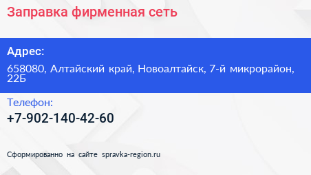 Заправка, фирменная сеть по адресу 658080, Алтайский край, Новоалтайск, 7-й микрорайон, 22Б в дальнейшем Организация, размещена в следующих категориях:
