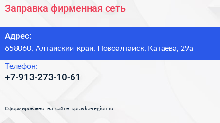 Заправка, фирменная сеть по адресу 658060, Алтайский край, Новоалтайск, Катаева, 29а в дальнейшем Организация, размещена в следующих категориях: