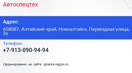 Автоспецтех по адресу 658087, Алтайский край, Новоалтайск, Переездная улица, 2а в дальнейшем Организация, размещена в следующих категориях: