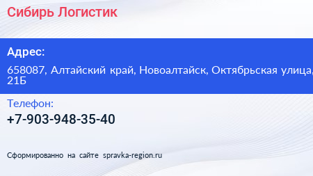 Сибирь-Логистик по адресу 658087, Алтайский край, Новоалтайск, Октябрьская улица, 21Б в дальнейшем Организация, размещена в следующих категориях: