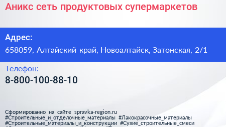 Аникс, сеть продуктовых супермаркетов по адресу 658059, Алтайский край, Новоалтайск, Затонская, 2/1 в дальнейшем Организация, размещена в следующих категориях: