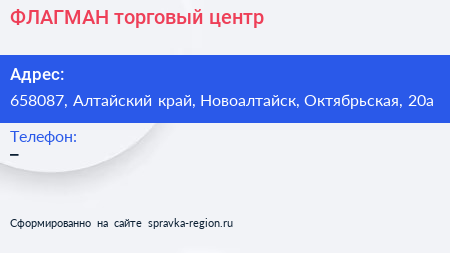 ФЛАГМАН, торговый центр по адресу 658087, Алтайский край, Новоалтайск, Октябрьская, 20а в дальнейшем Организация, размещена в следующих категориях: